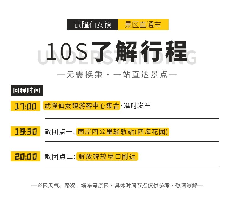 特别注意:节假日如有交通管制,回程无法停靠解放碑。只能在四公里下车!给您带来不便敬请谅解,谢谢!