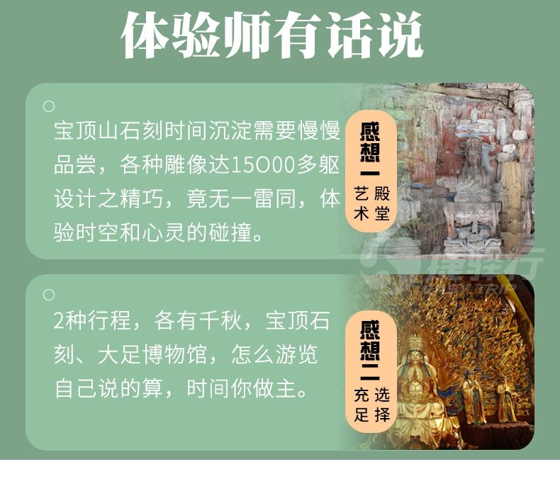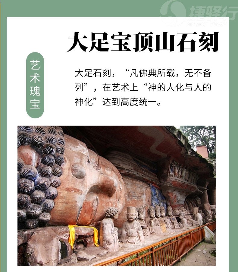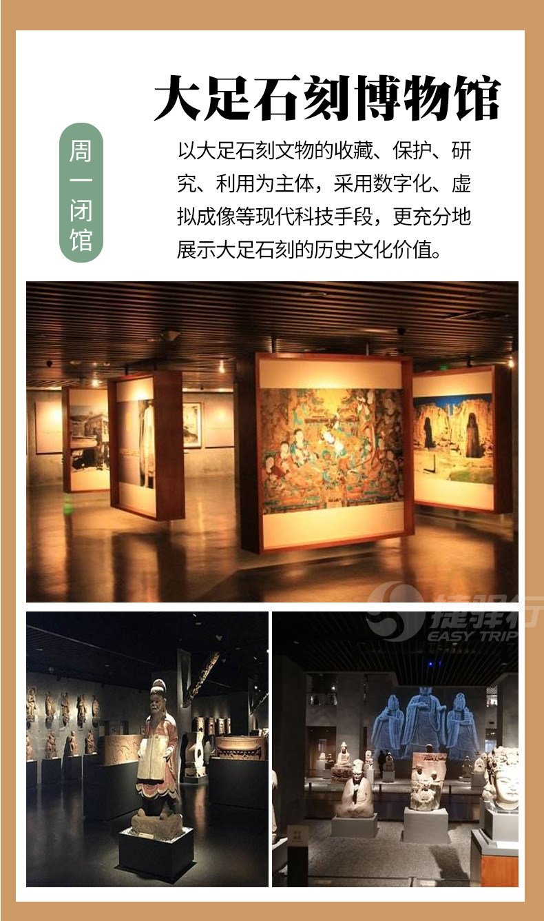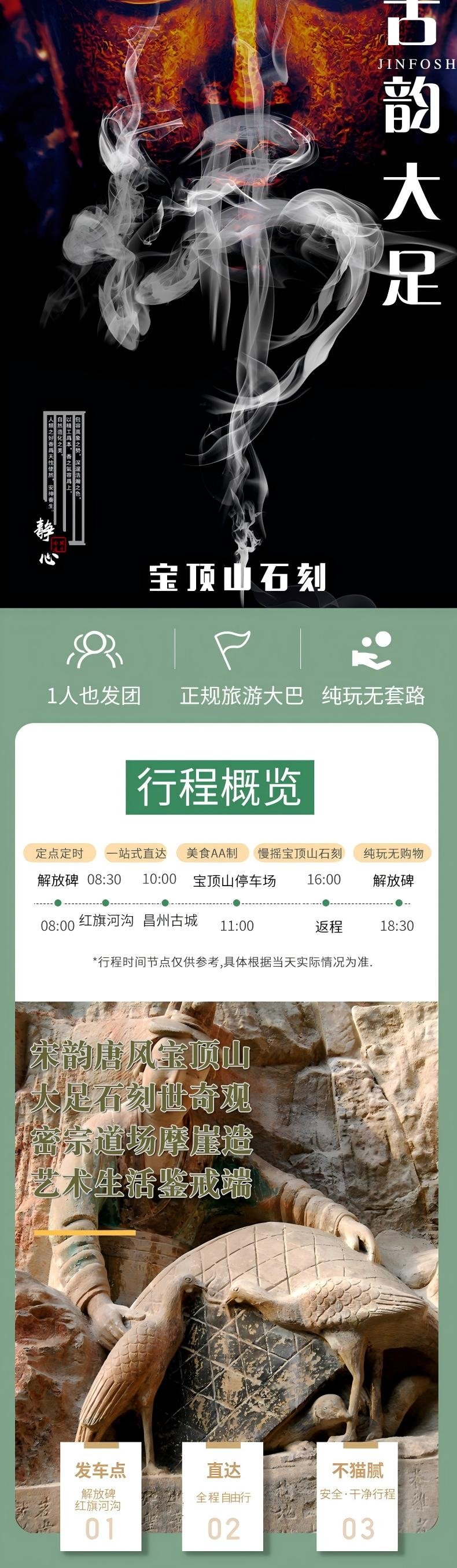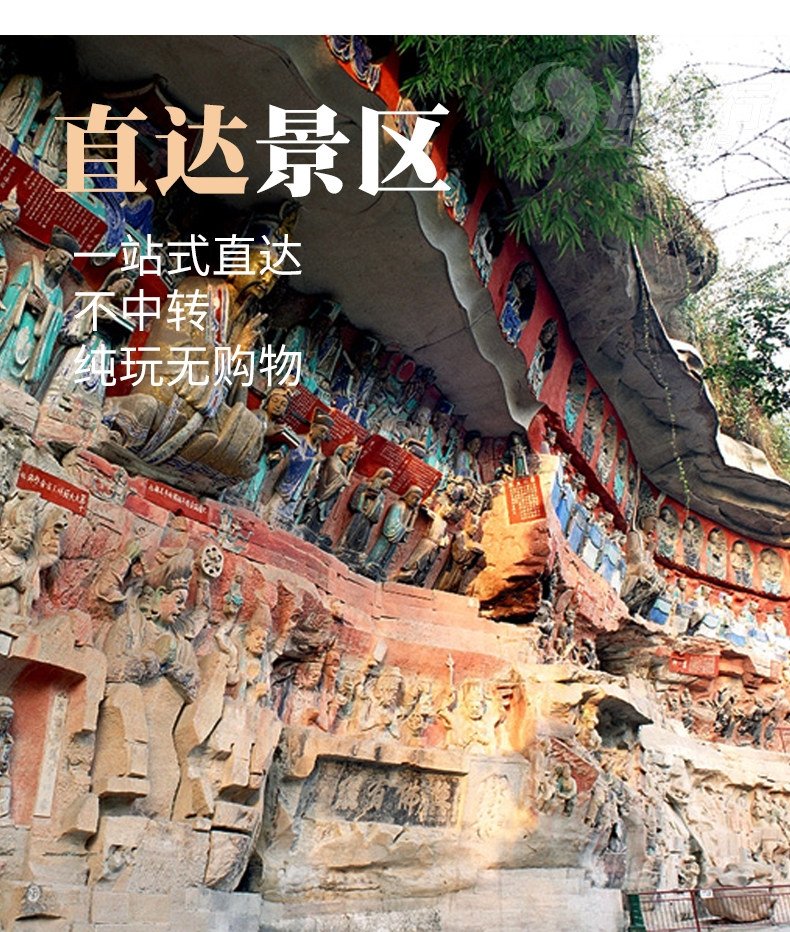 ①去程:8:00 解放碑较场口重庆大轰炸遗址 -- 8:30 红旗河沟汽车站(重庆红旗河沟汽车站)--昌州古城(30分钟)--大足石刻旅游景区(终点)